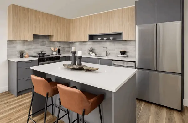 • Ray scheme with updated ½” shaker frame upper cabinet doors and Oak wood grain island and accent cabinets